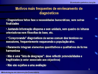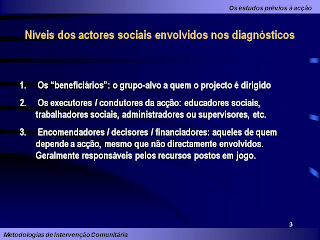 A sociologia de intervenção; o papel do diagnóstico no contexto da intervenção; a construção de projectos sociais; função do educador; dos métodos clássicos à metodologia participada; o auto-diagnóstico comunitário e institucional.